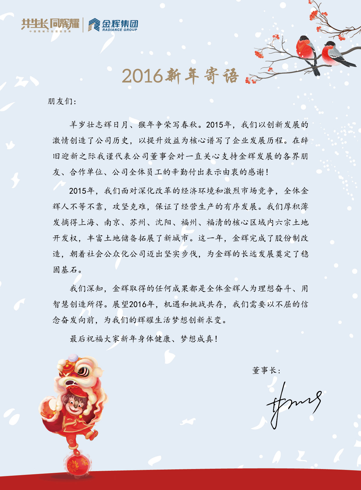 2016年金輝集團董事長新年寄語